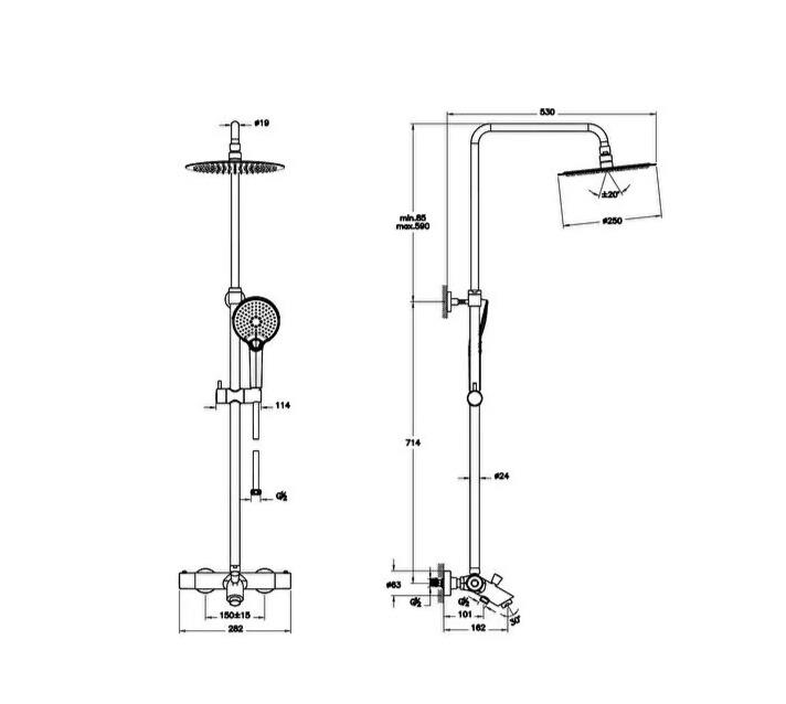 Uyarı ve Genel Açıklamalar: 23 mm çapında ana kolon. Duş başlığının yukarı-aşağı yükseklik ayarı için teleskopik özellik. Termostatik batarya, duş başlığı ve el duşu ürüne dahildir. 250 mm çapında tepe duşu. 120 mm çapında el duşu. Armatür üzerindeki 2 yollu yönlendirici suyu duş başlığı veya el duşuna yönlendirir. 38 derece üzerindeki sıcaklıklara istenmeden çıkılmasını engelleyici emniyet butonu. Sıva altı montaj yapılmadan kullanılmaktadır.