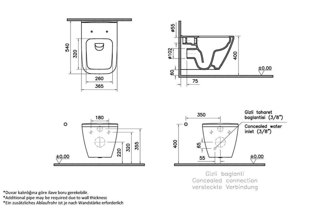 Taharet borusu girişi sıva altı uygulamalı, montaj deliksiz. Klozet kapağı hariçtir. Ayrıca sipariş edilmelidir. 191-001-009 ve 191-001R009 kodlu slim yavaş kapanır klozet kapakları ile kullanılabilir. 742-XXXX-01 748-XXXX-01 gömme rezervuarlar ile uyumludur. Montaj deliksizdir, yan taraflarında montaj boşlukları bulunmaz ve üründe tasarım bütünlüğü sağlanır.