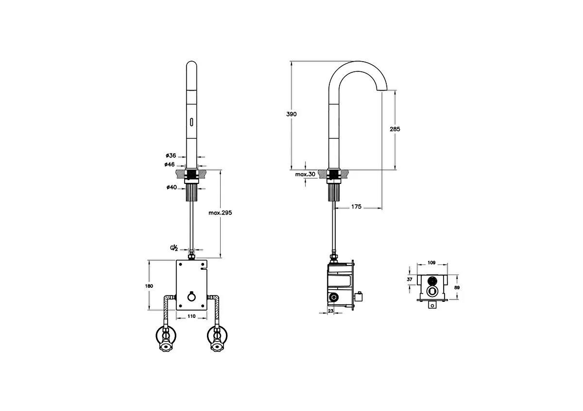 Akış başladıktan 60 sn sonra emniyet amacı ile otomatik olarak su kapanmaktadır. Çıkış ucu uzunluğu 175 mm’dir. Çıkış ucu yüksekliği 285 mm’dir. Çift (sıcak-soğuk) su bağlantılıdır. 6V elektrik ile çalışır. Özel debi kısıcılı perlatör sayesinde max. 9 L/dk su akışı sağlanmaktadır. Cache (gizli) perlatör. Kontrol ve valf ünitesi ürüne dahildir. Ürüne teması engellemek ve enerji tasarrufu sağlamak amacıyla sıcaklık ayarı ve emniyet kontrolü üniteden yapılmaktadır. Armatür merkezi ile lavabo hazne başlangıcı arası max. 70 mm olmalıdır. Çanak lavabonun yüksekliği max. 140 mm olmalıdır.