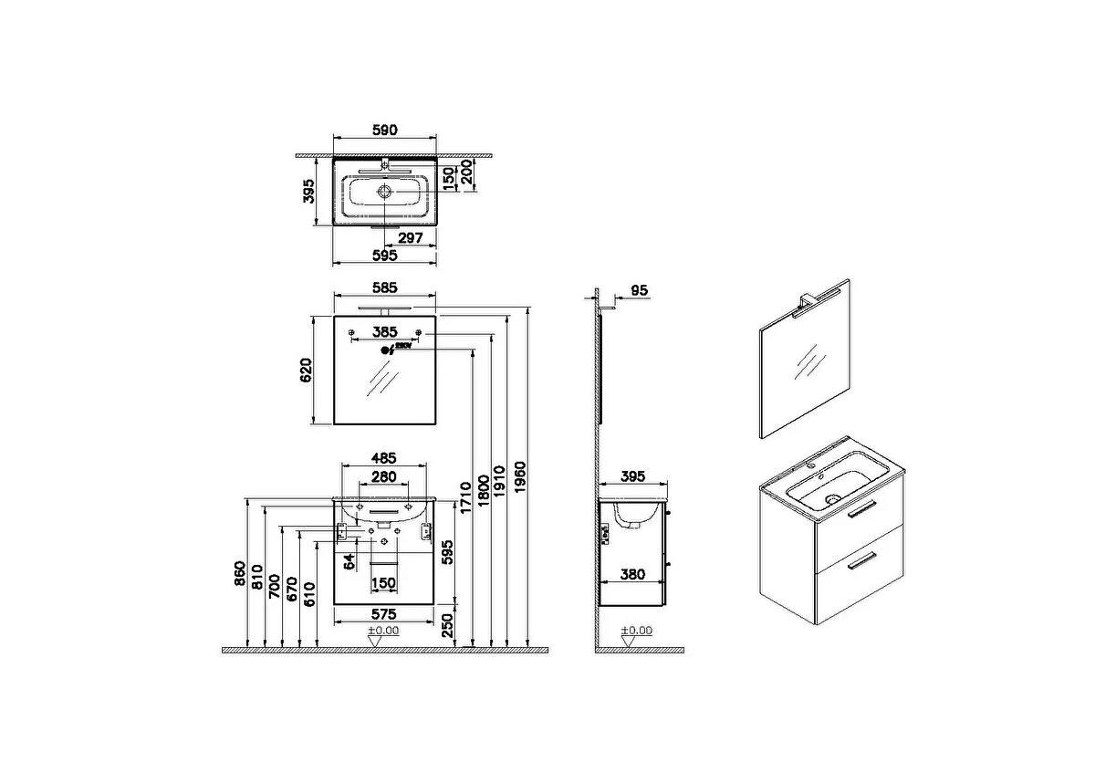 Uyarı ve Genel Açıklamalar: Set; lavabo dolabı, 7461L003-0002 seramik lavabo ve aydınlatmalı aynadan oluşmaktadır. Aynanın Ölçüleri: 62x59 cm