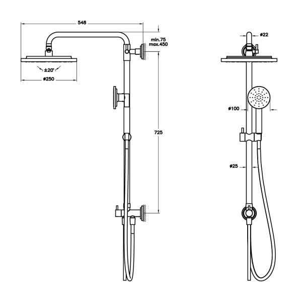 25 mm çapında kolon. Ø250 mm duş başlığı ürüne dahildir. El duşu ürüne dahildir. Duş başlığının yukarı-aşağı yükseklik ayarı için teleskopik özellik. Chroma-tech spiral uzunluğu 1.500 mm’dir. Batarya ile duş kolonu arası bağlantı spirali uzunluğu 600 mm’dir ve ürüne dahildir. Kolon üzerindeki 2 yollu yönlendirici suyu duş başlığı veya el duşuna yönlendirir. Alttan el duşu çıkışlı (G 1/2”) duş veya banyo bataryaları ile kullanılmalıdır. Sıva altı montaj yapılmadan kullanılmaktadır.