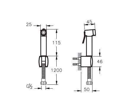 A45223 ankastre el duşu çıkışı veya 1/2" dirsek ile uygulanabilir. Tüm ankastre stop valflerle ve ara musluklarla uyumludur. Metal el duşludur. Spiral uzunluğu: 1200 mm. El duşu ürüne dahildir. G 3/8" - G 1/2" adaptör ürüne dahildir.